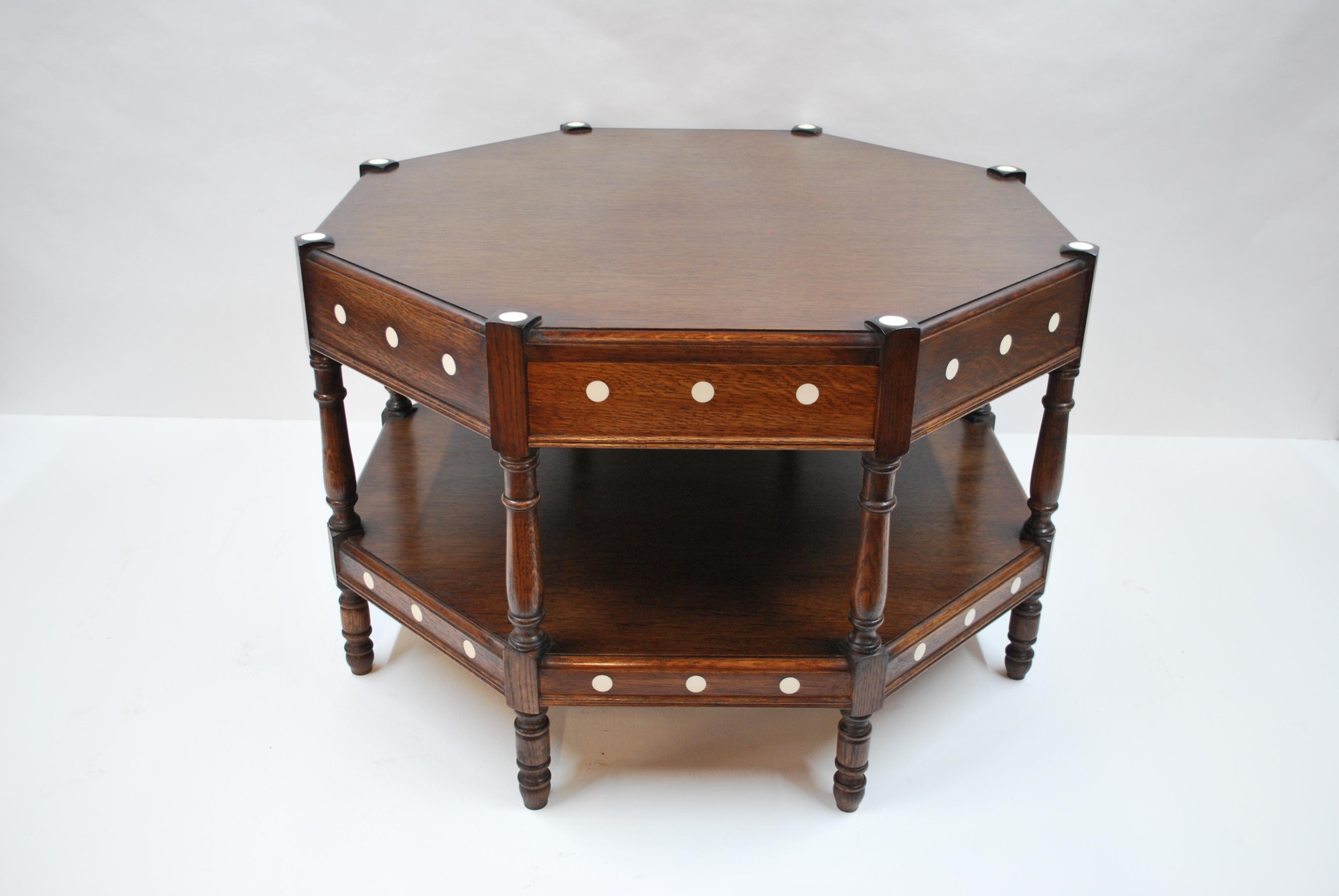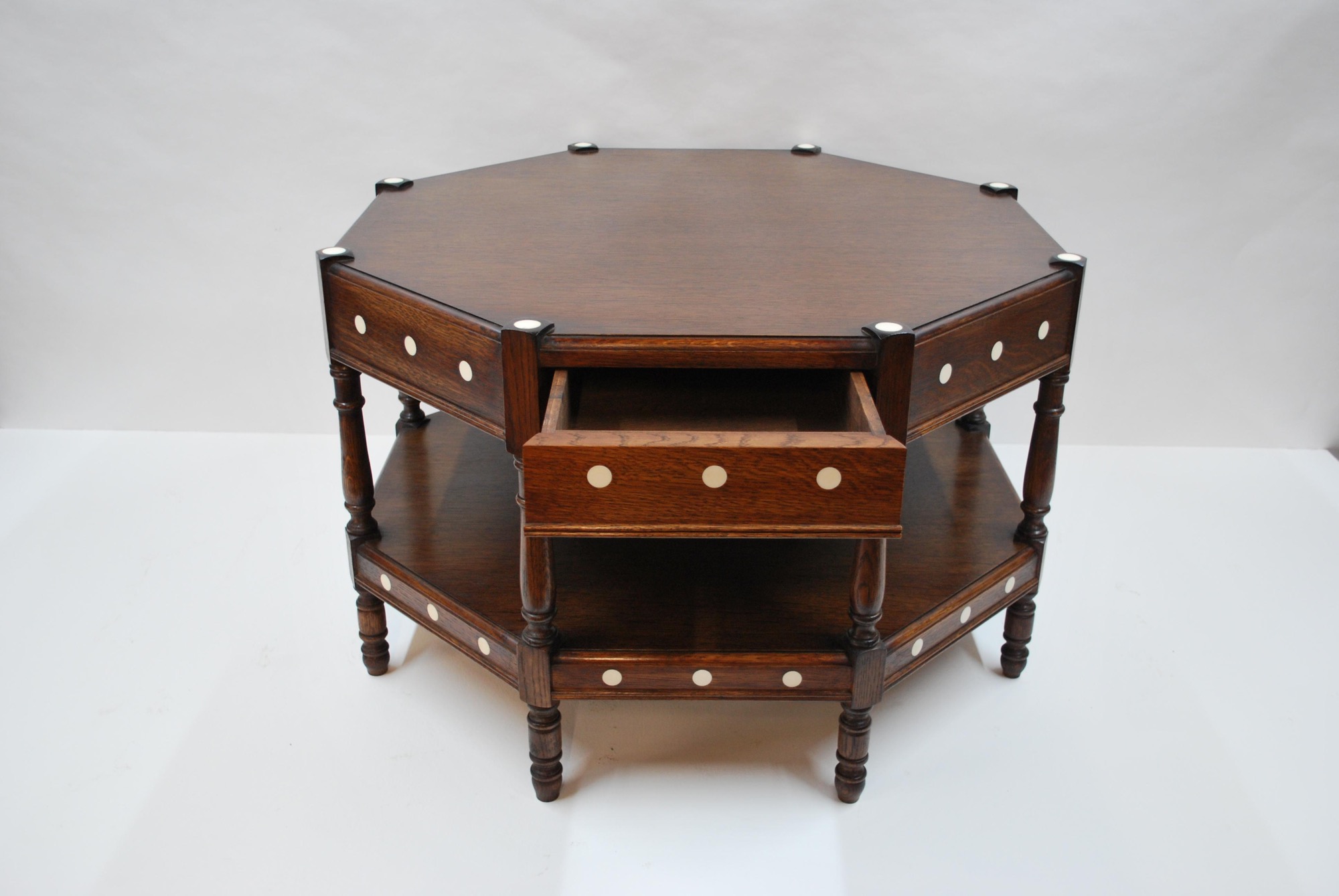 - Octagonal oak two-tier table with resin inlay and concealed drawer