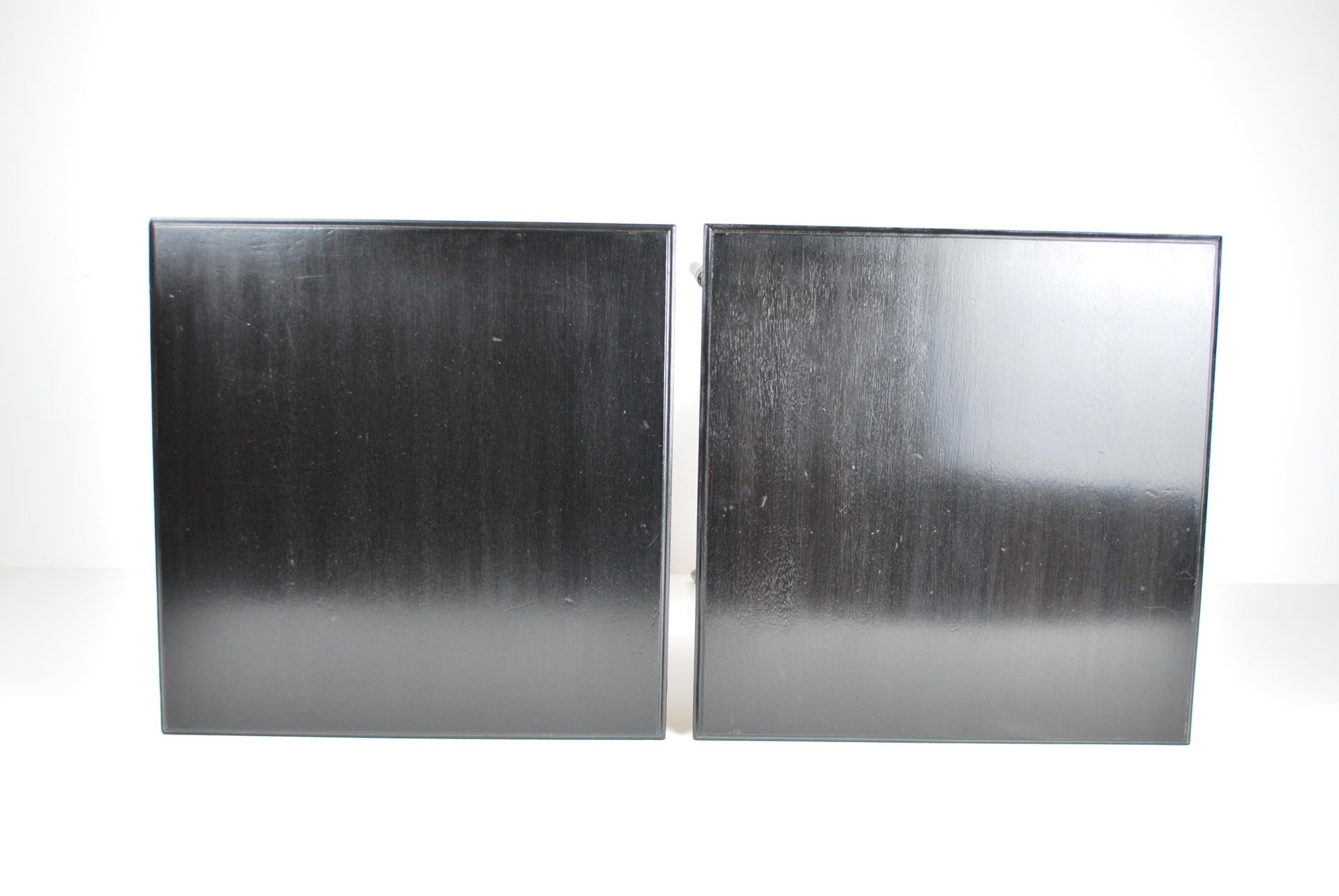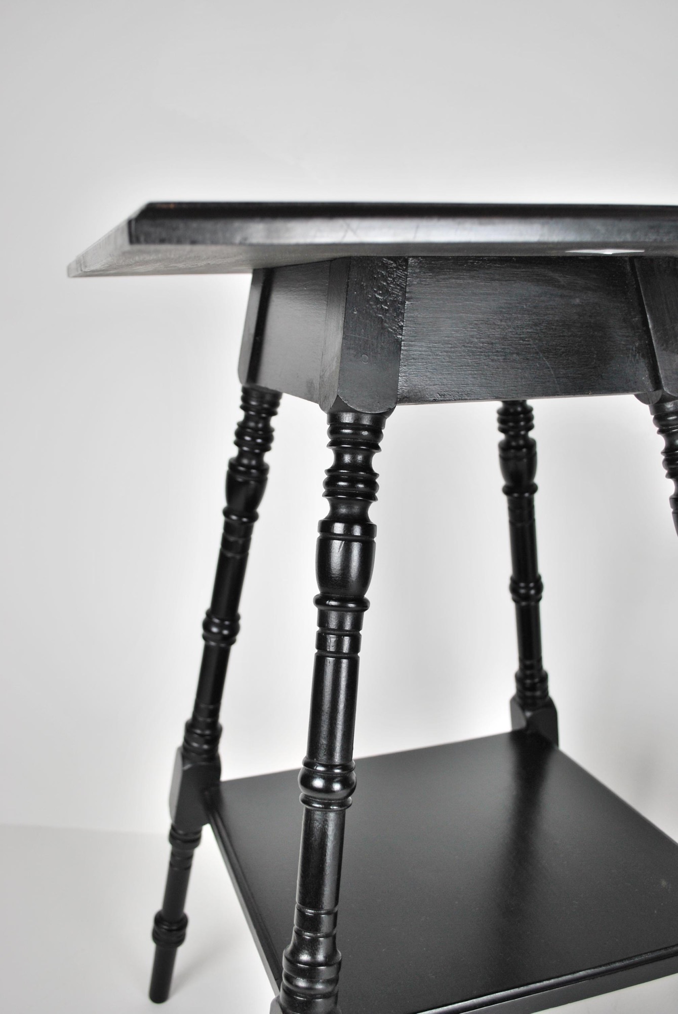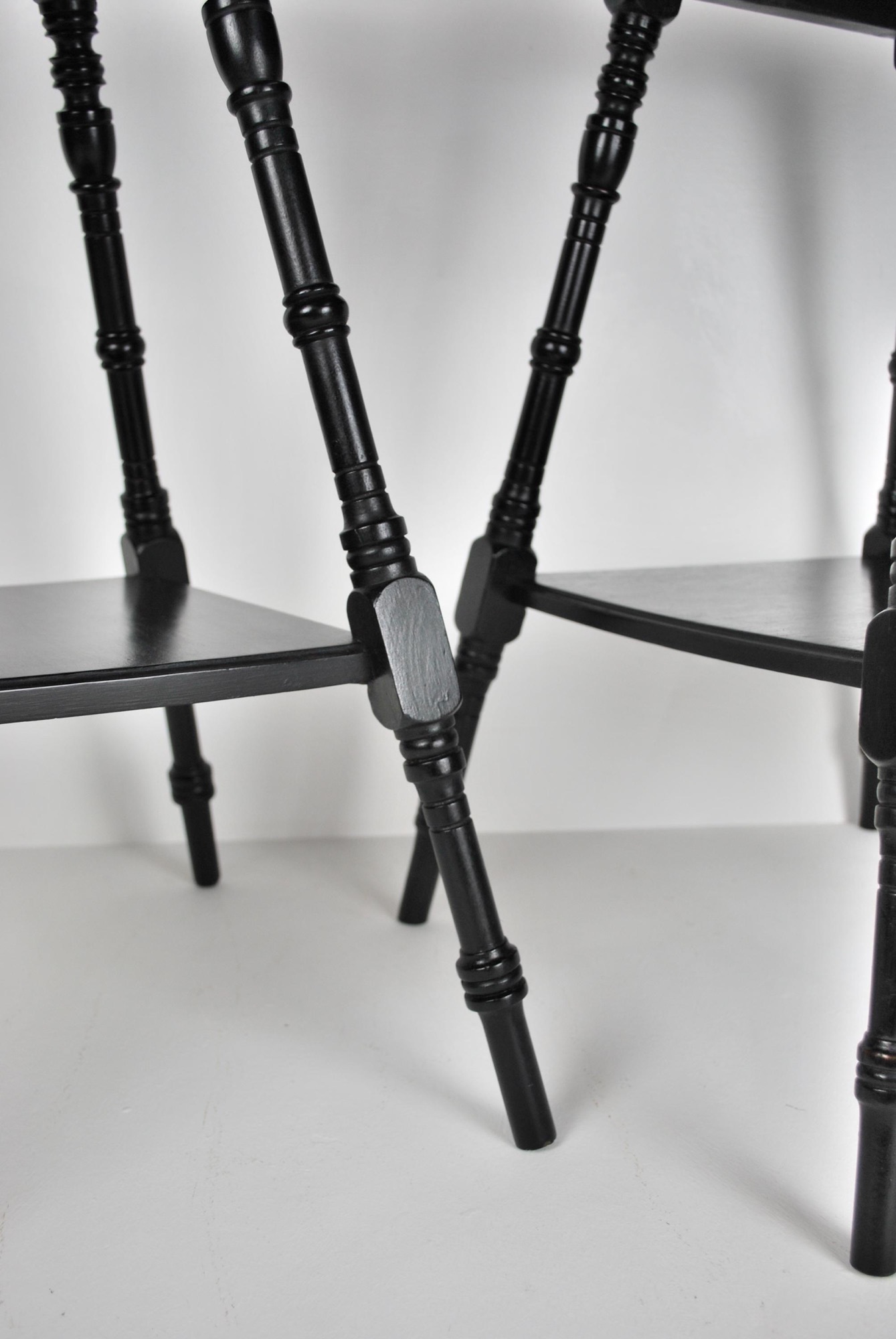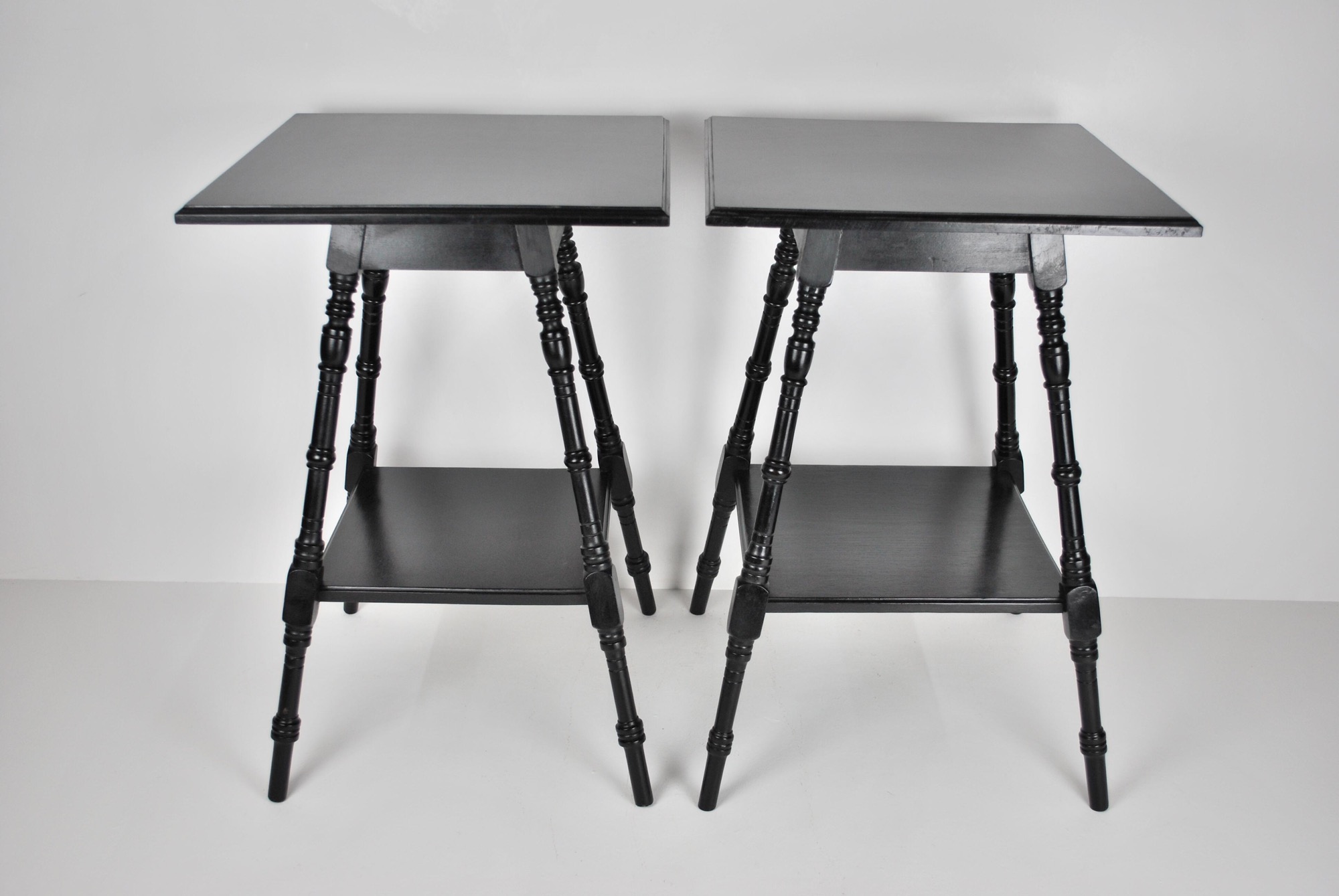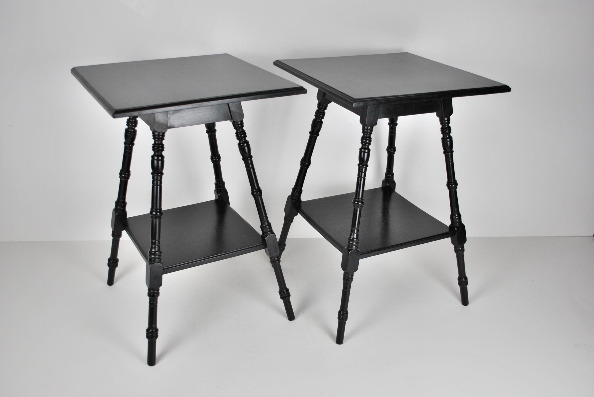 - Pair of aesthetic movement ebonised walnut occasional tables in the manner of E.W. Godwin